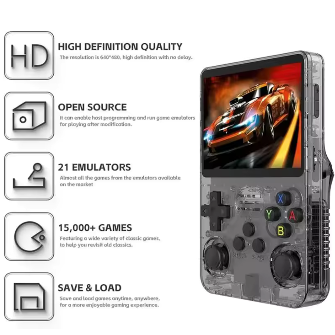 La Consola Portátil R36S trae de vuelta esa magia de los videojuegos clásicos, combinando nostalgia, tecnología moderna y diversión sin límites. Compacta, ligera y con un diseño elegante, esta joya del entretenimiento te permite disfrutar miles de juegos retro preinstalados donde quieras: en casa, en el autobus o mientras viajas.